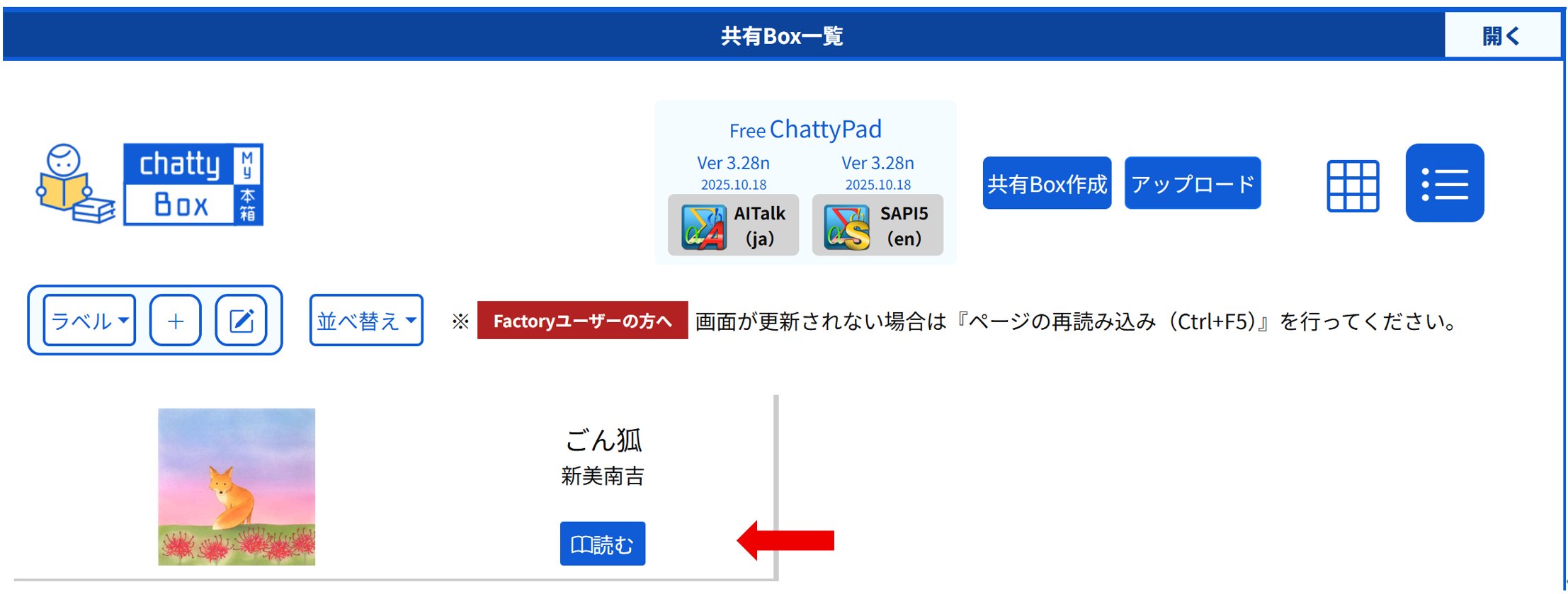 共有された図書には「作成年月日」「有効期限」は表示されず、ボタンは『読む』のみが表示されます。