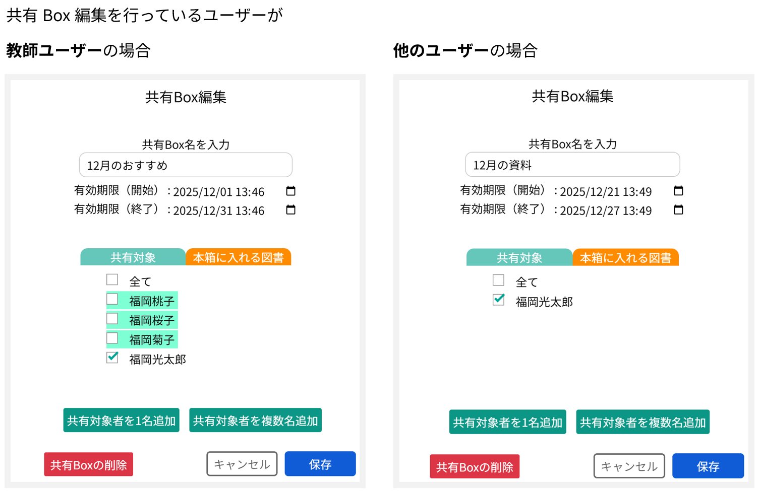 共有する図書を選択後、「共有Boxの編集」を『保存』すると、共有対象者の共有Box一覧に、共有Box名が表示されます。
