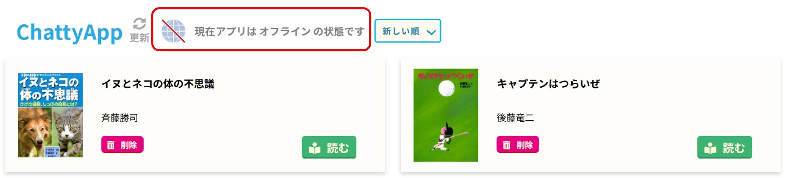 Chatty アプリを利用すると、MY本箱の図書を、インターネットに接続されていない状態(オフライン)でも読むことができます。