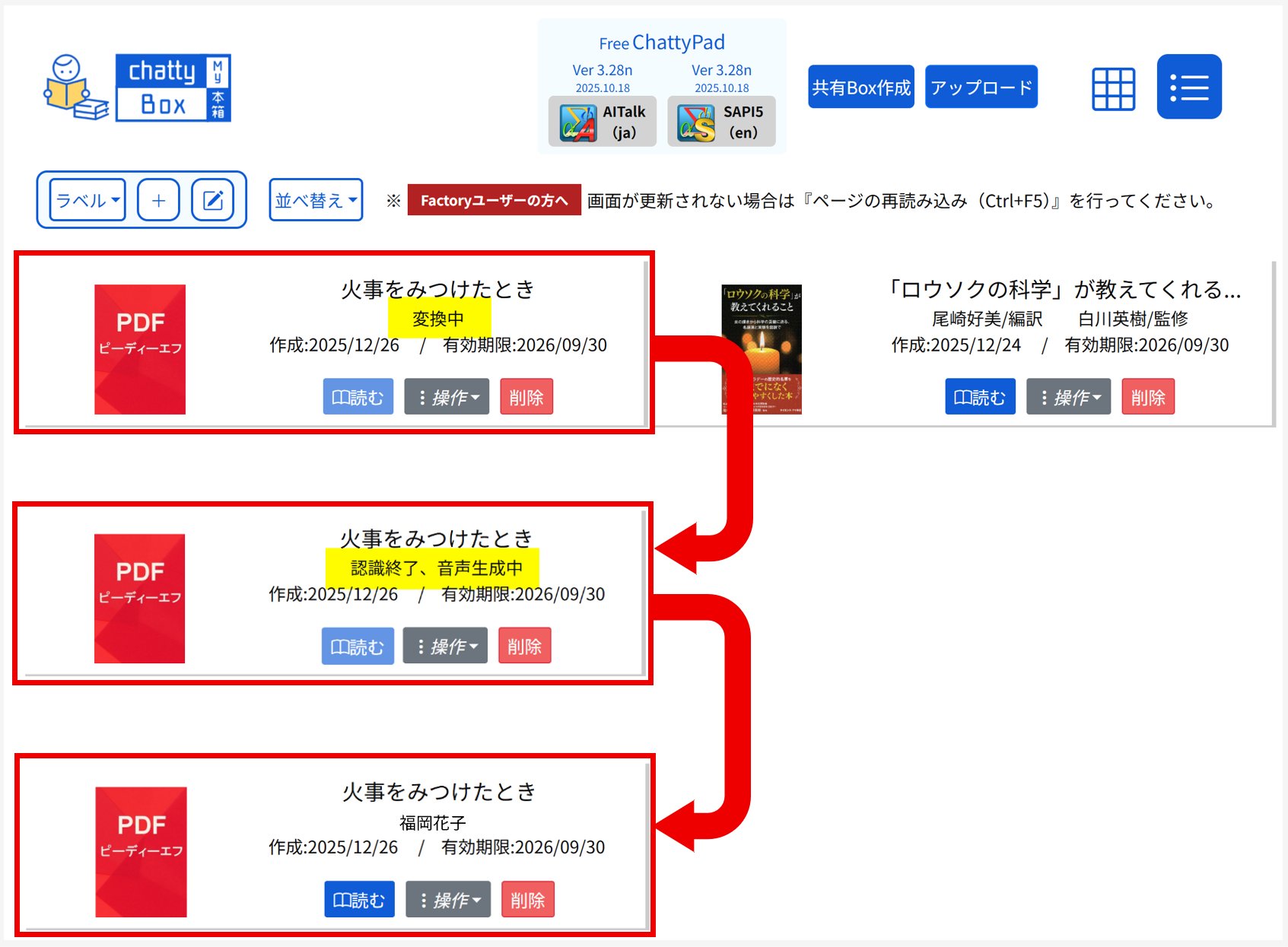 変換が完了すると、「変換中」⇒(ログインしているユーザーの氏名)と表示が変わり、『読む』ボタンが有効になります。