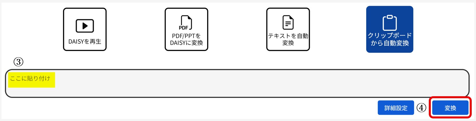 変換サービスは、『DAISYを再生』『PDF/PPTをDAISYに変換』『テキストを自動変換』『クリップボードから自動変換』の4種類があります。
