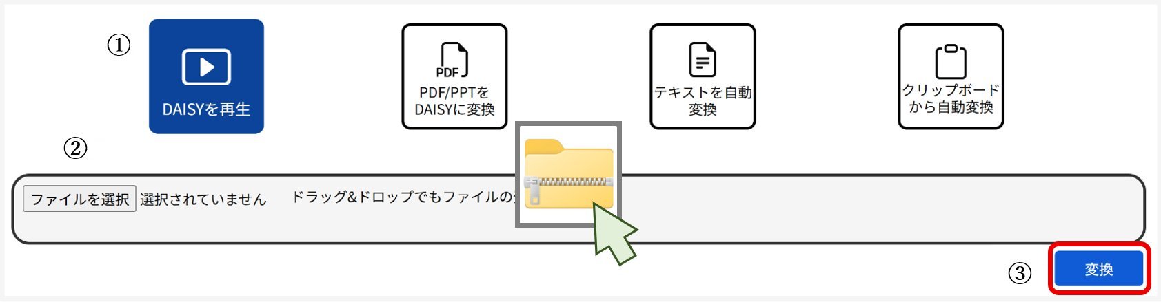 ② zip形式のマルチメディアデイジー2.02、或いはそれと同様のアクセシビリティーを備えたEPUB3を選択、またはファイルエリアにドラッグ&ドロップします。