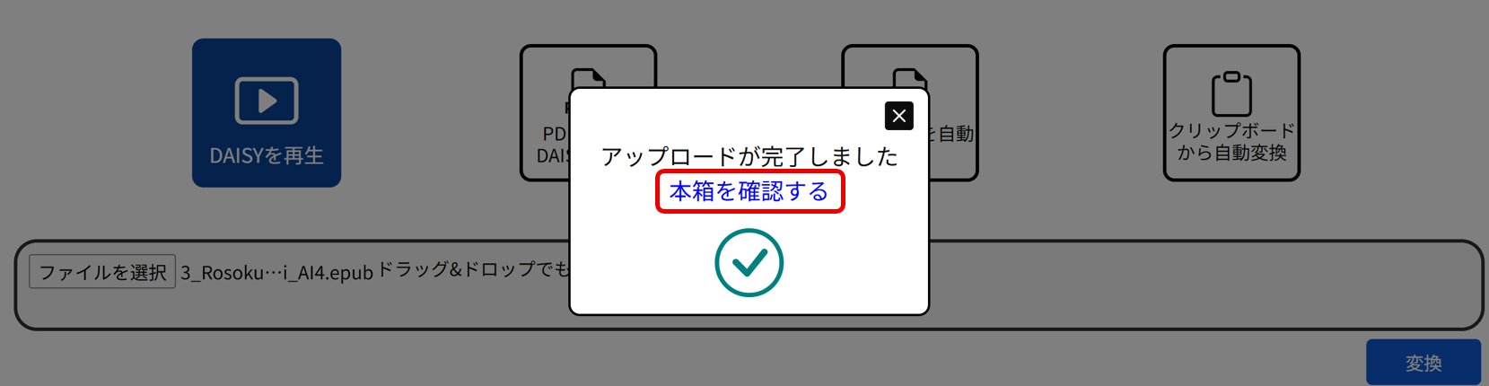 アップロードが完了するとメッセージが表示されますので『本箱を確認する』をクリックします。